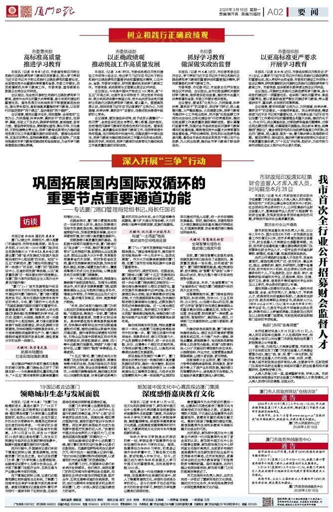规划先行,谋定而后动。任国岩说,厦门港将以《厦门港“十五五”发展规划》编制和《厦门港总体规划》修订为契机,进一步优化厦门港各港区功能定位——强化海沧集装箱核心港区功能定位,重点发展外贸集装箱中远洋运输;优化东渡港区码头功能,逐步调减散杂货运输功能,大力发展国际邮轮运输;加快推动翔安港区集装箱泊位建设,近期发展内贸和近洋集装箱运输。这一以海沧港区为主,东渡港区、翔安港区为支撑的“一主两副”集装箱运输格局,将推动港口功能与临港产业向更广阔的海湾腹地纵深布局。