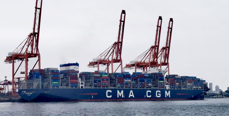 2月2日凌晨紧急靠泊海通4号泊位的超大型外籍集装箱船“达飞奥西里斯(CMA CGM OSIRIS)”轮