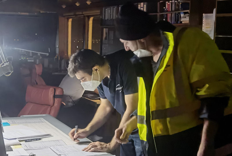 外籍船员协助引航员校对船位、核算船舶航行数据