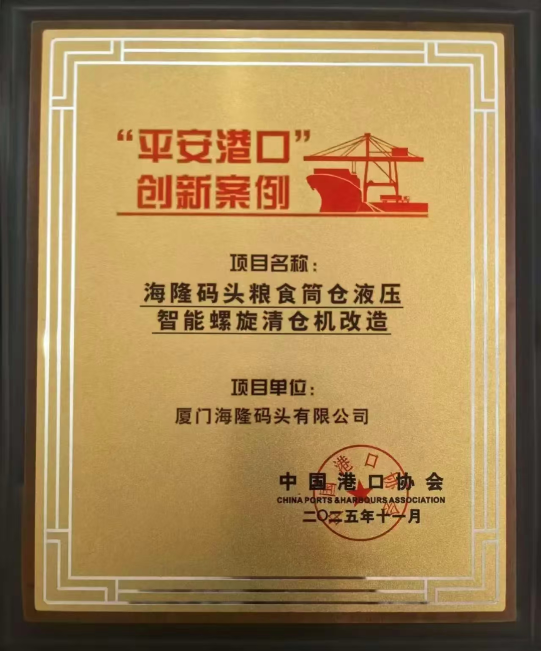 近日,中国港口协会公布“平安港口”创新案例征集评选结果,厦门海隆码头有限公司的“海隆码头粮食筒仓液压智能螺旋清仓机改造”项目榜上有名,获评“平安港口”创新案例。