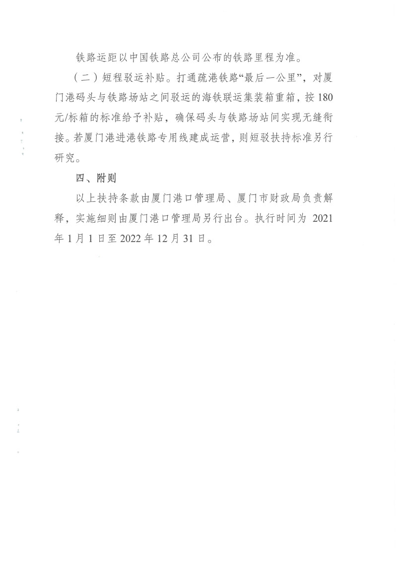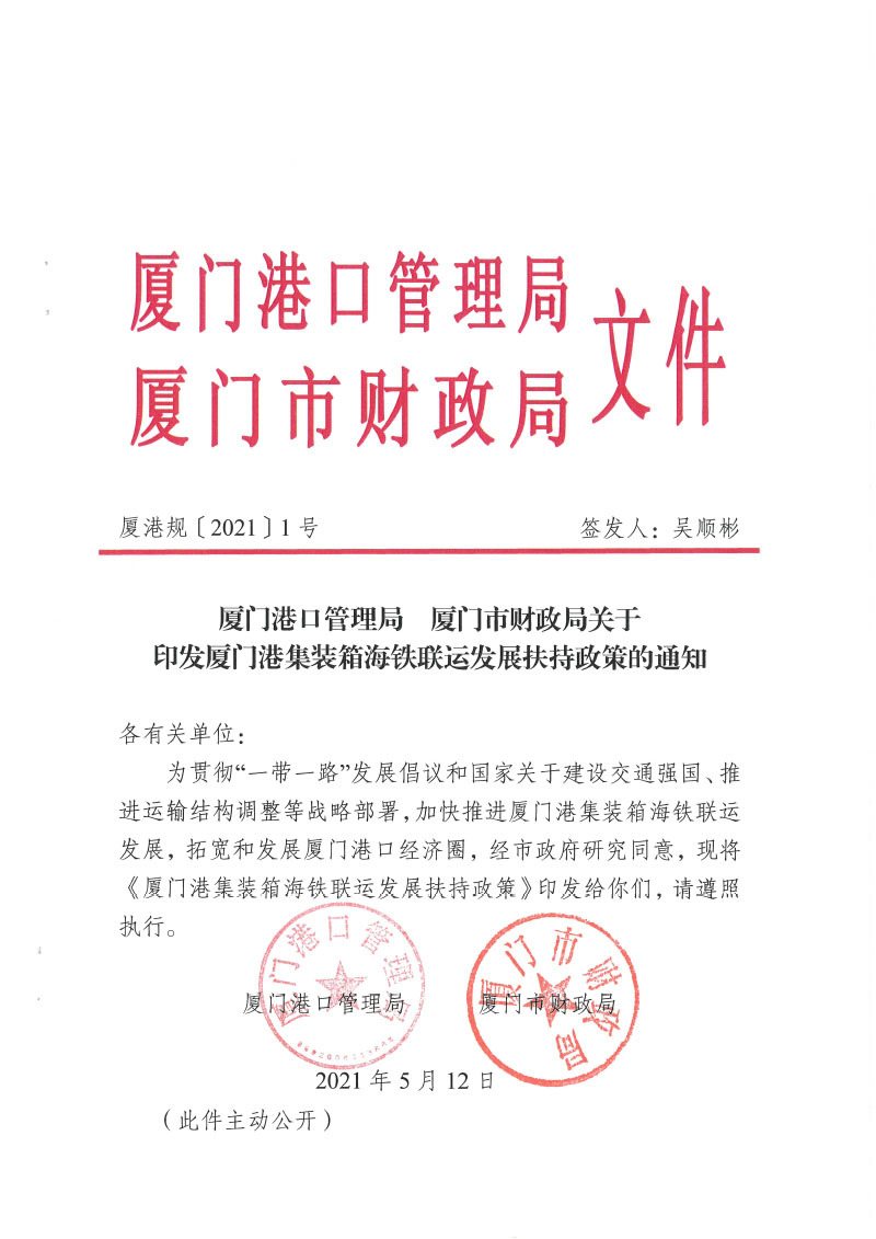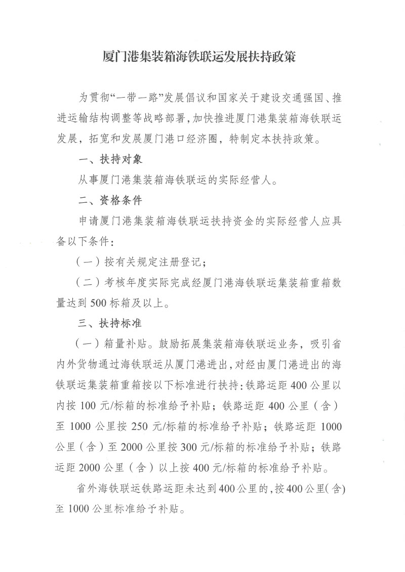 厦门港口管理局 厦门市财政局关于印发厦门港集装箱海铁联运发展扶持政策的通知