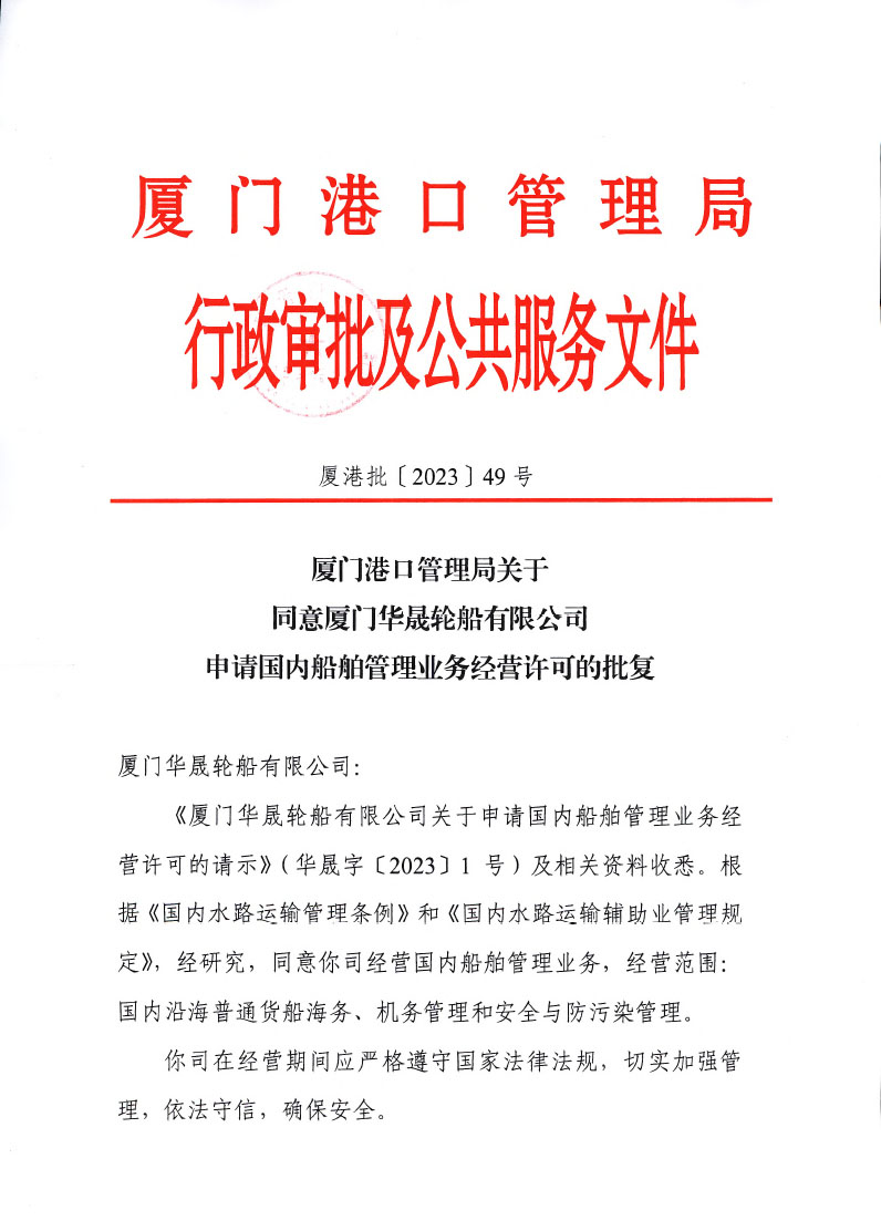 厦门港口管理局关于同意厦门华晟轮船有限公司申请国内船舶管理业务经营许可的批复