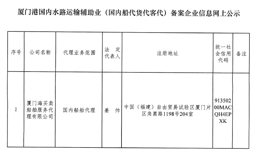 厦门港国内水路运输辅助业(国内船代货代客代)备案企业信息网上公示(海买卖船舶)