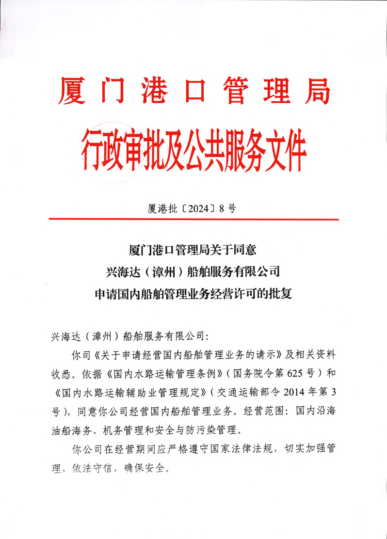 厦门港口管理局关于同意兴海达(漳州)船舶服务有限公司申请国内船舶管理业务经营许可的批复