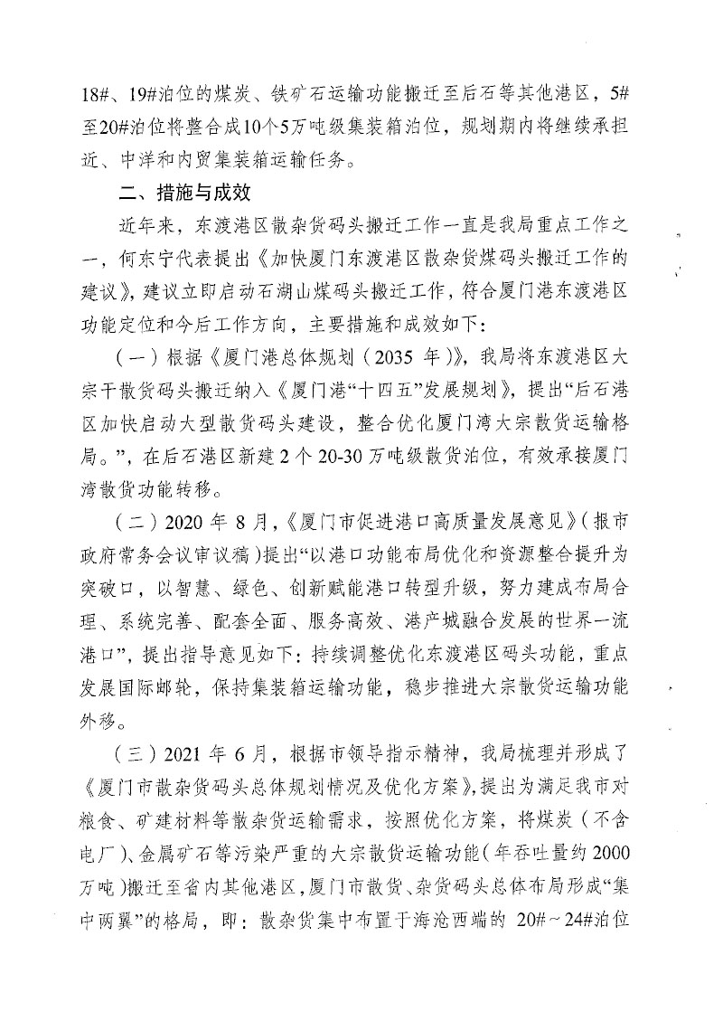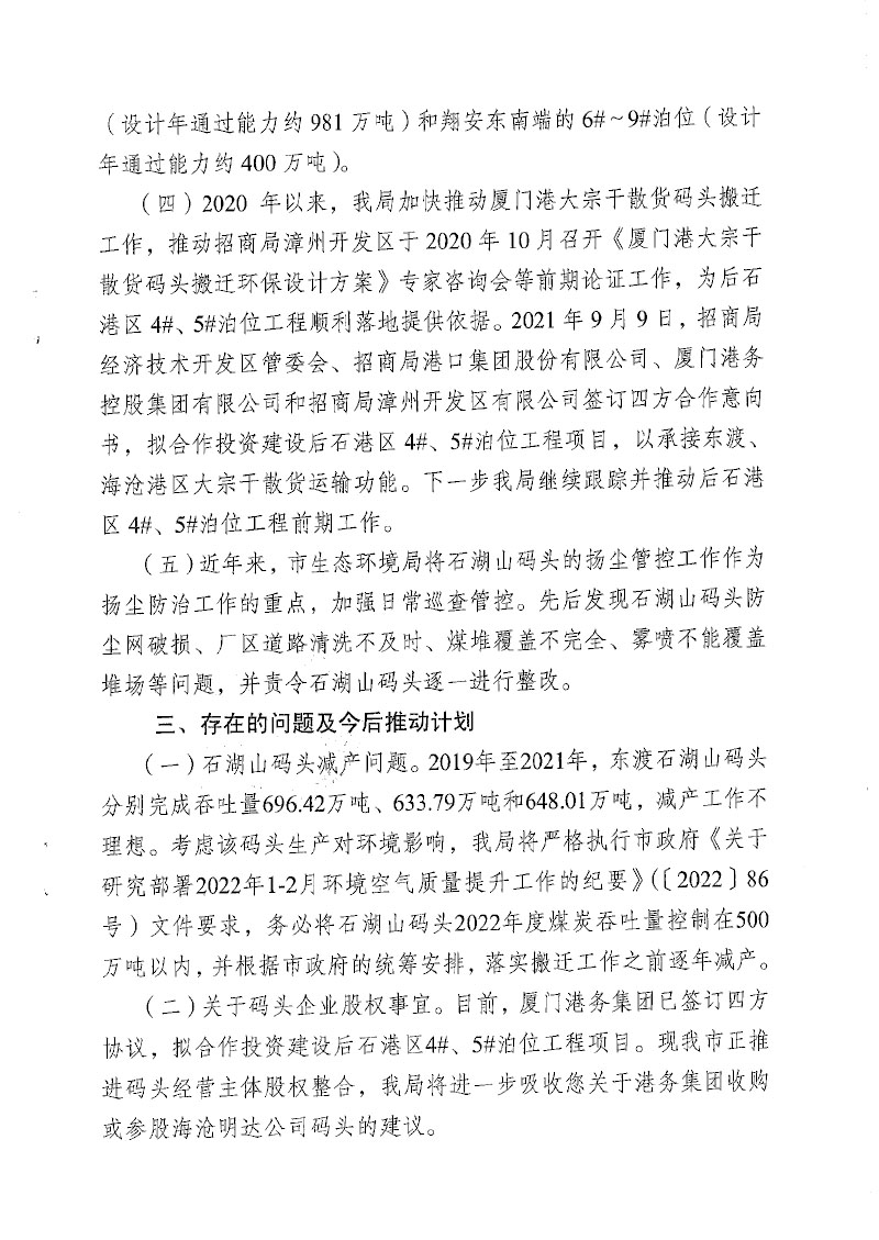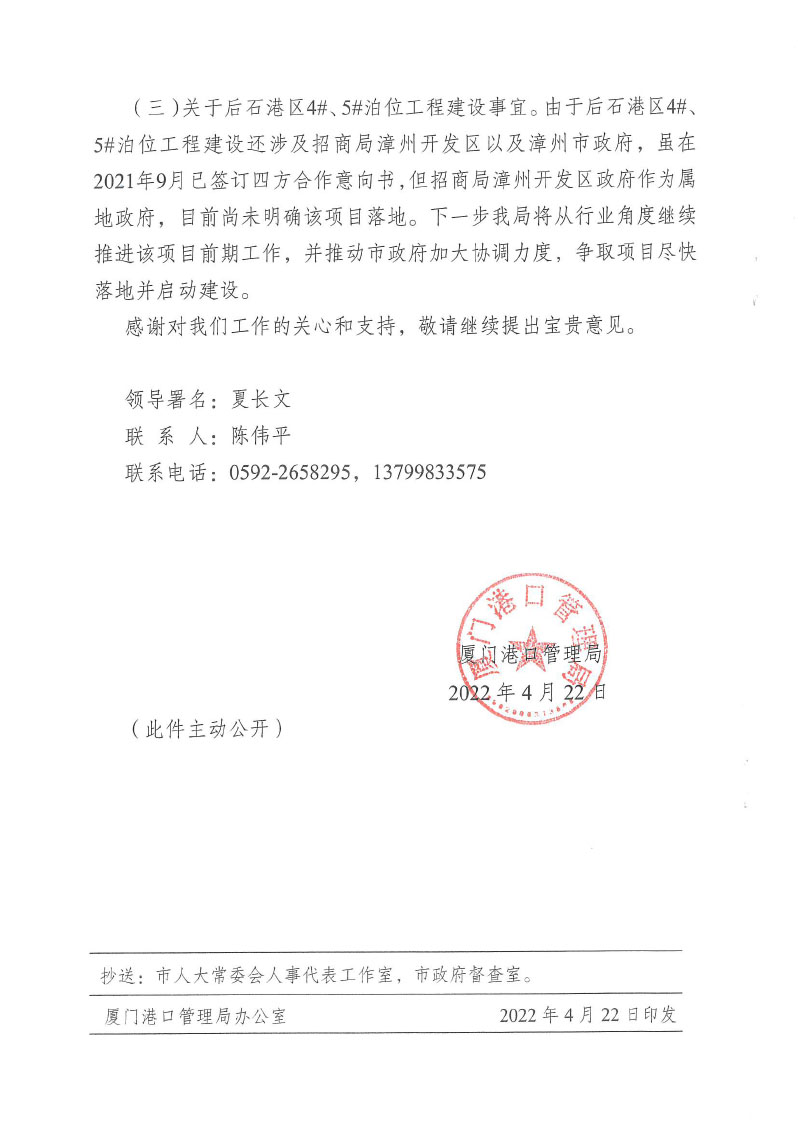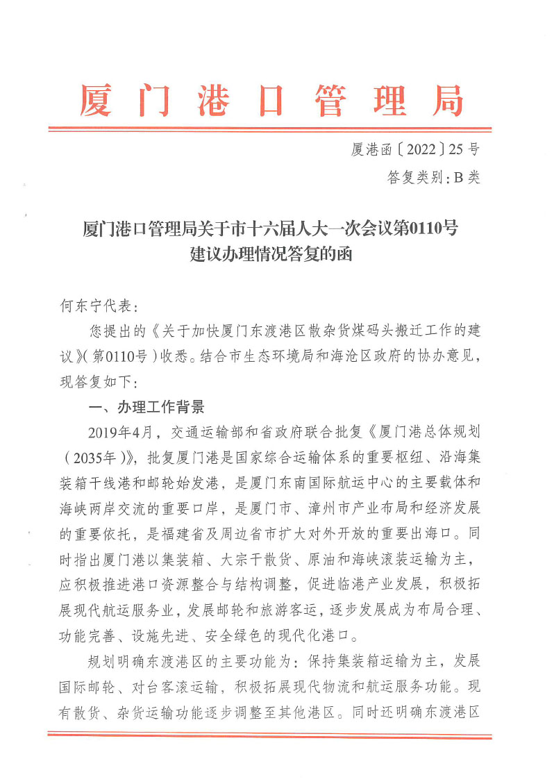 厦门港口管理局关于市十六届人大一次会议第0110号建议办理情况答复的函