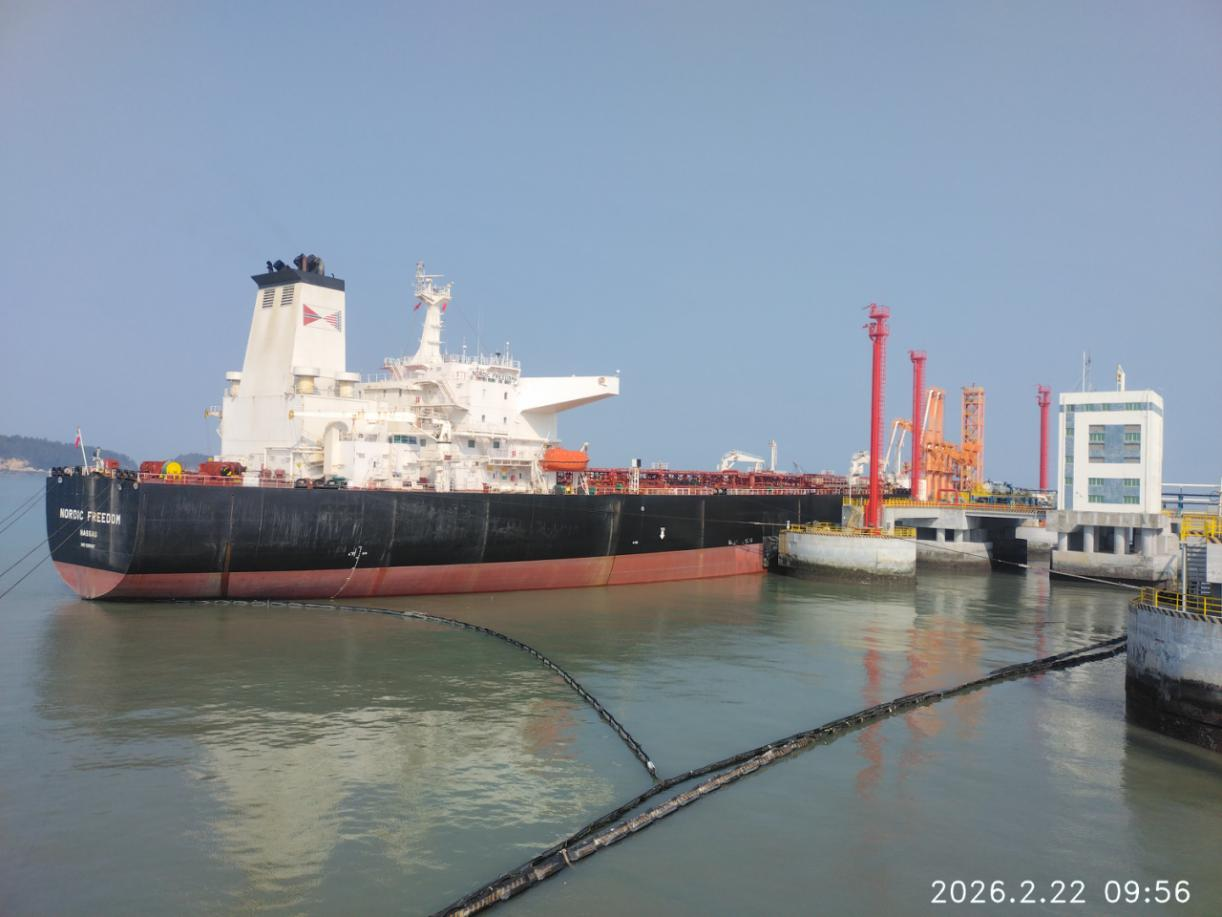 新年伊始,开足“马”力。2月21日,巴哈马籍油轮“北欧自由”顺利靠泊古雷港区南2#泊位,这艘载运14.7万吨常压渣油的超大型油轮,不仅为新春增添了亮丽的“开门红”,也生动展现了节日期间港口“不停工、不停产”的拼搏实干精神。