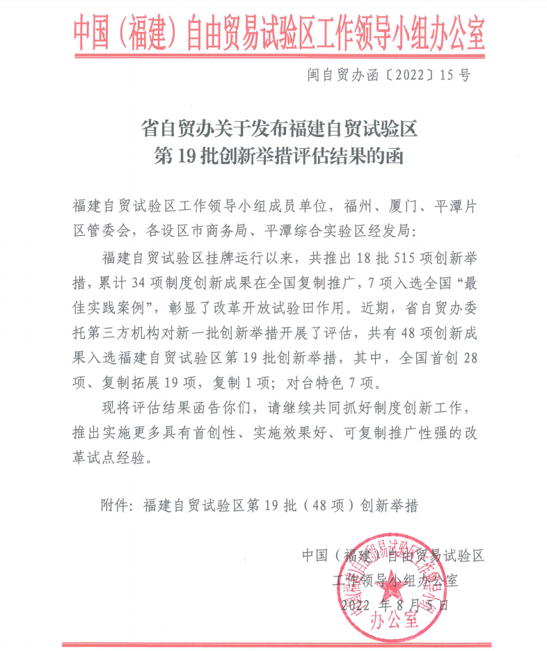 省自贸办关于发布福建自贸试验区第19批创新举措评估结果的函